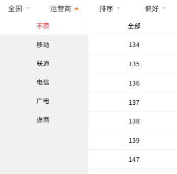 一:归属地可选,可以选择全国的归属地,作为筛选条件获取号码